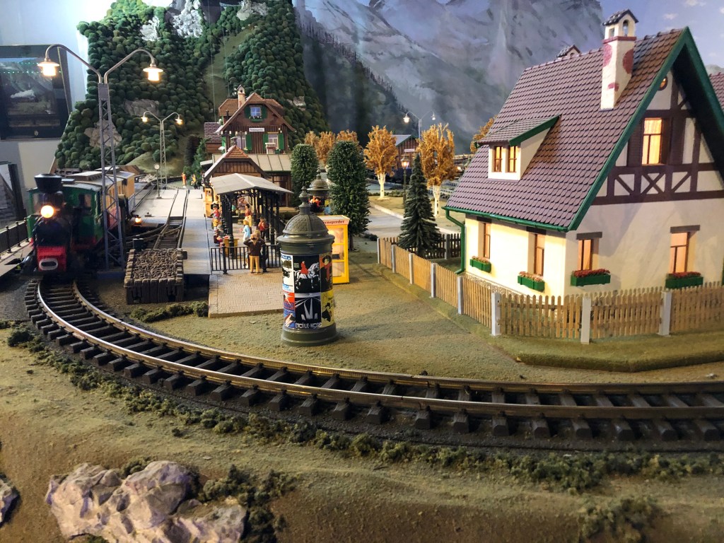 Rayle points to the wooden bench where Erna Liebrandt likes to come and sit and watch the trains run on a 600-square-foot display modeled after the town of Schonweiler in southern Germany near the Austrian border. Erna and her husband, Gunnar, were born in Germany and she donated her husbandโs prized display after his death. The volunteers at the station helped to build and triple its size, adding a church, mountain backdrop and tunnel for the trains to pass through.