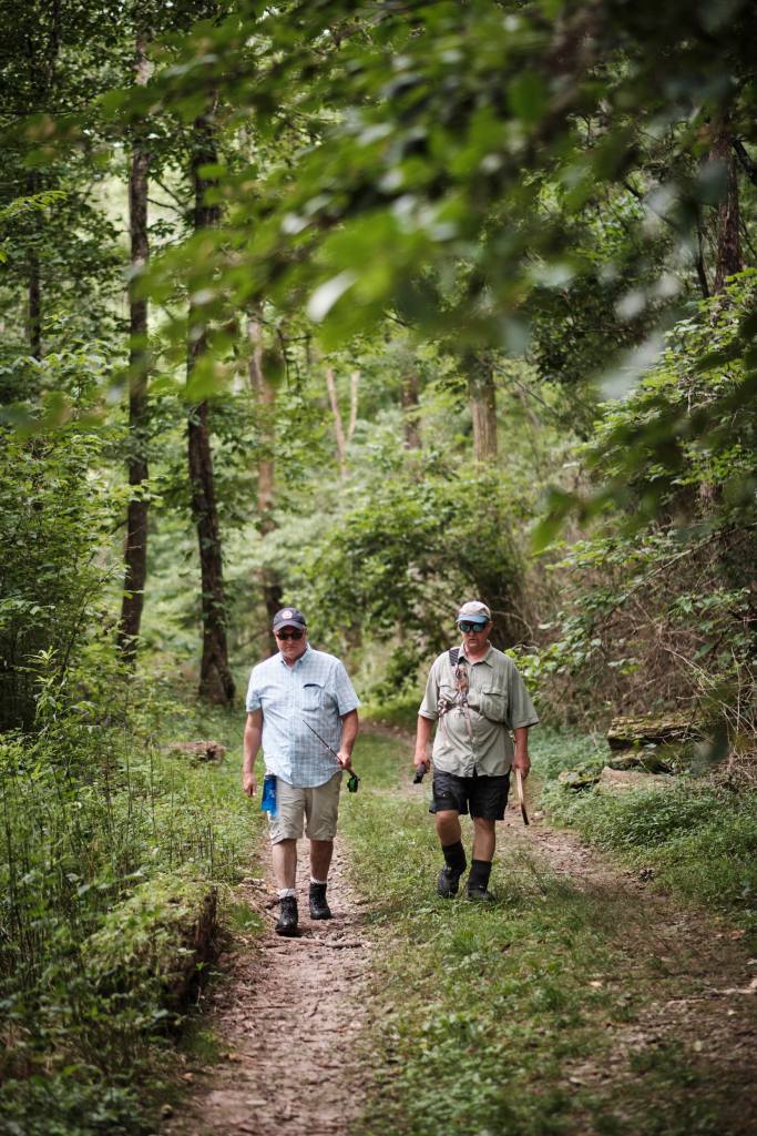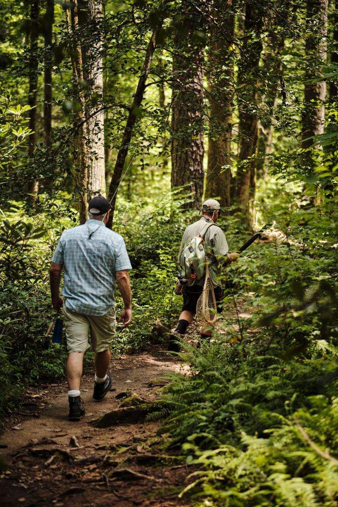There is a dirt path leading through the mountain laurel and rhododendron with their clusters of colorful flowers. Hemlocks and pines shoot straight into the blue sky. With hands holding fly rods and feet wrapped in wading boots, we make our way single file through the mountainous Sumter National Forest in Upstate South Carolina.