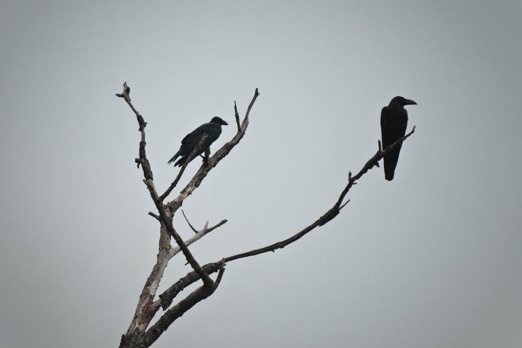 The crow is black. The crow is foreboding.